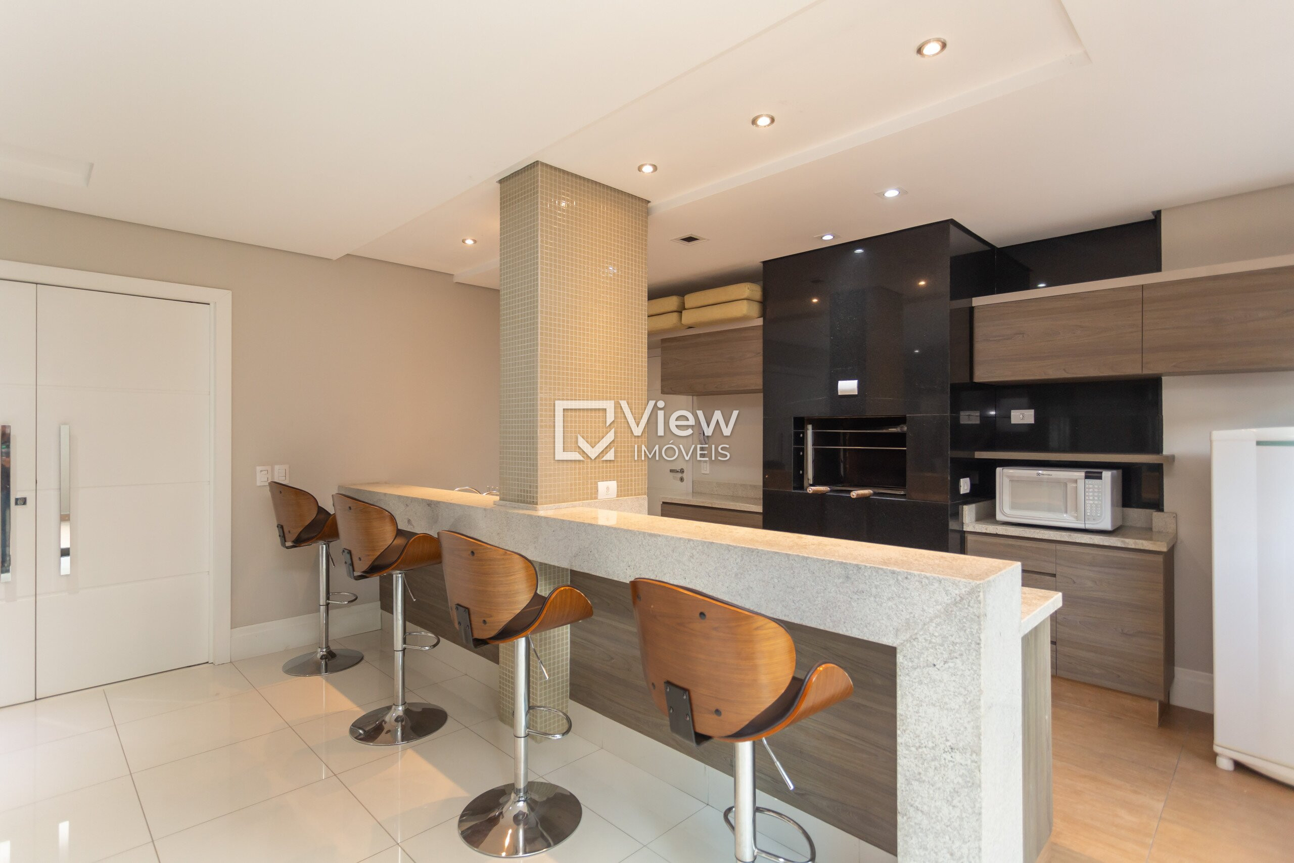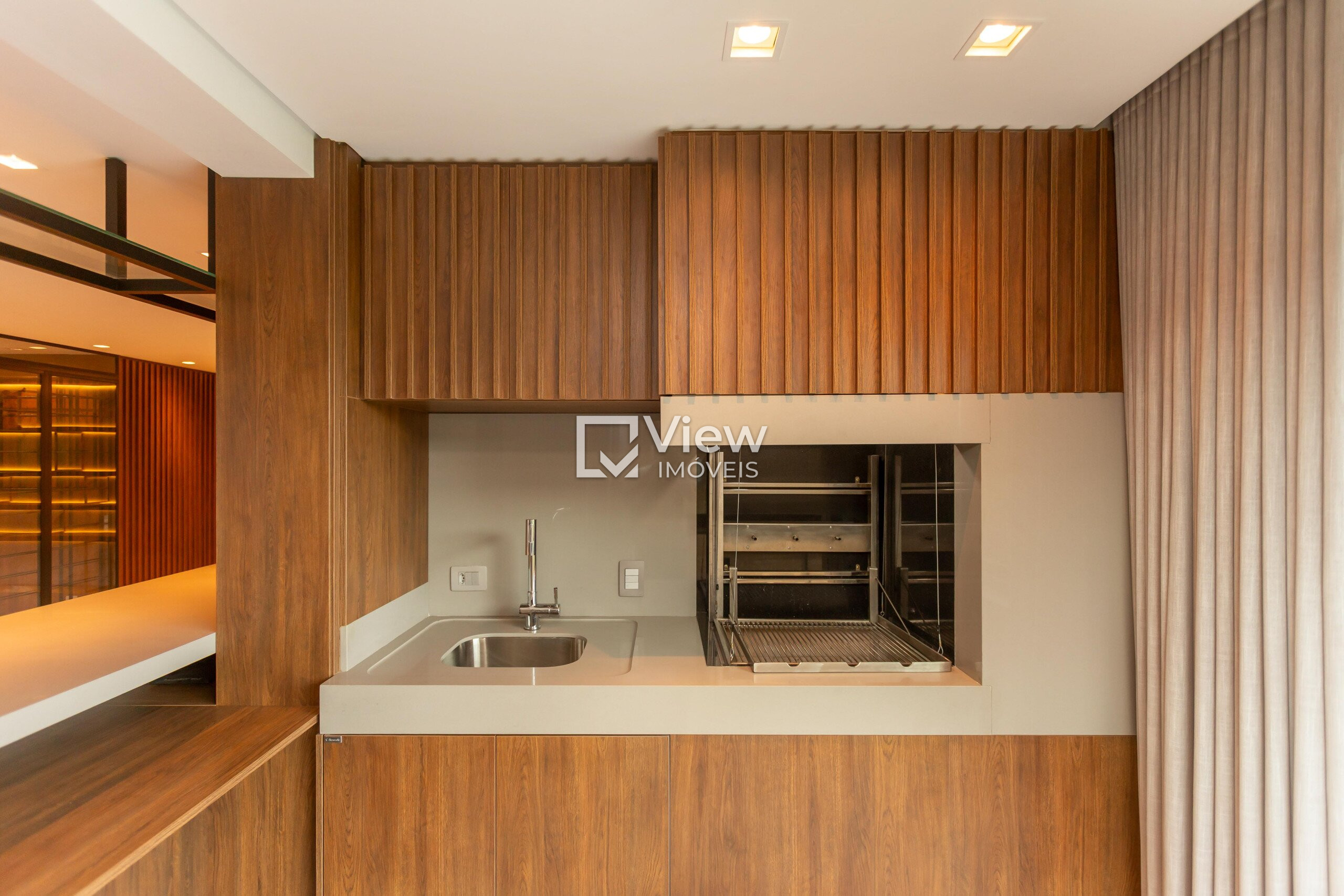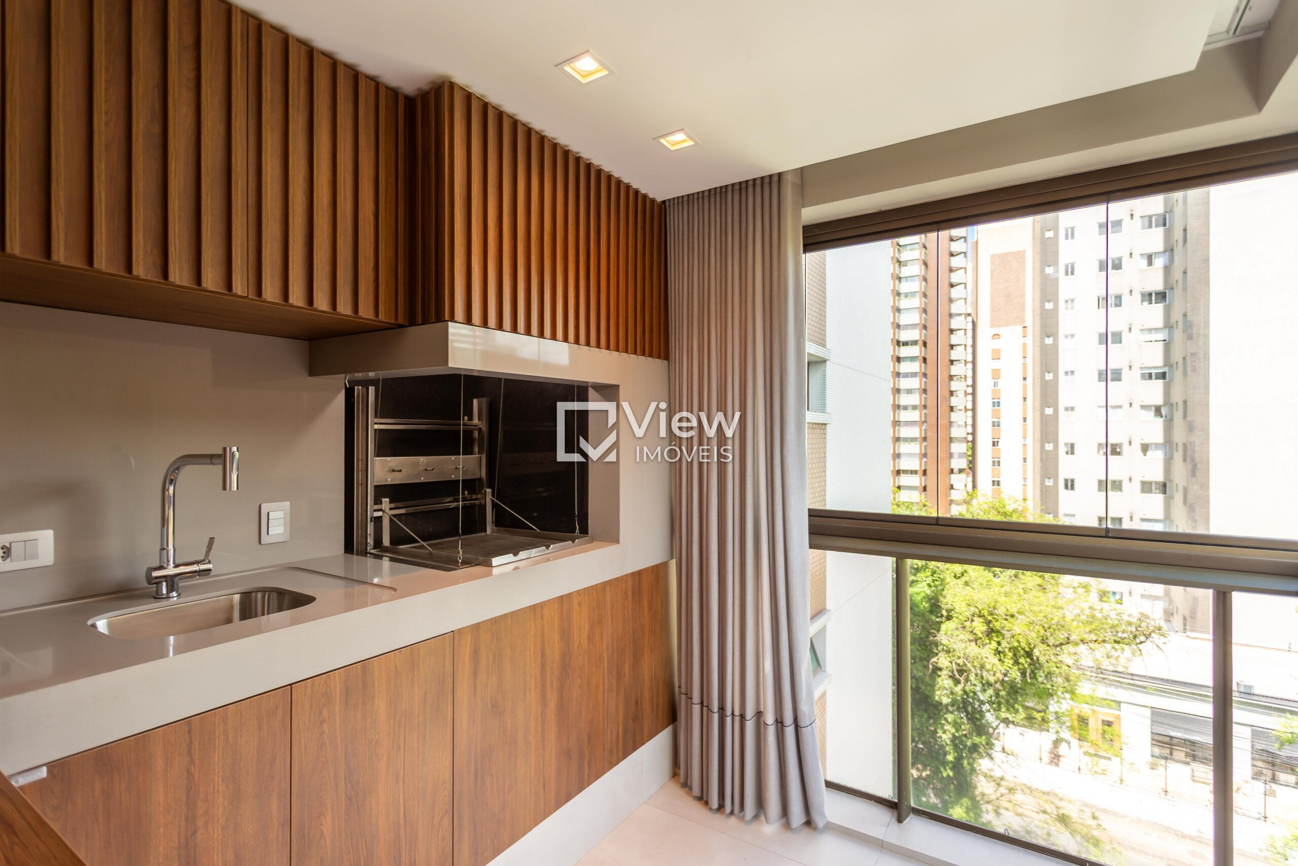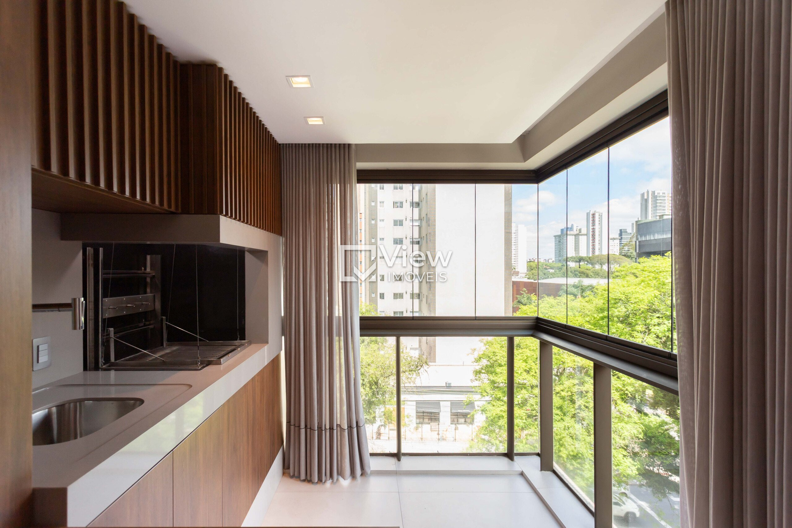 A sacada é fechada com sistema Reik, proporcionando conforto térmico e acústico, além de integrar-se perfeitamente à churrasqueira a carvão automatizada, tornando momentos de convivência ainda mais especiais.