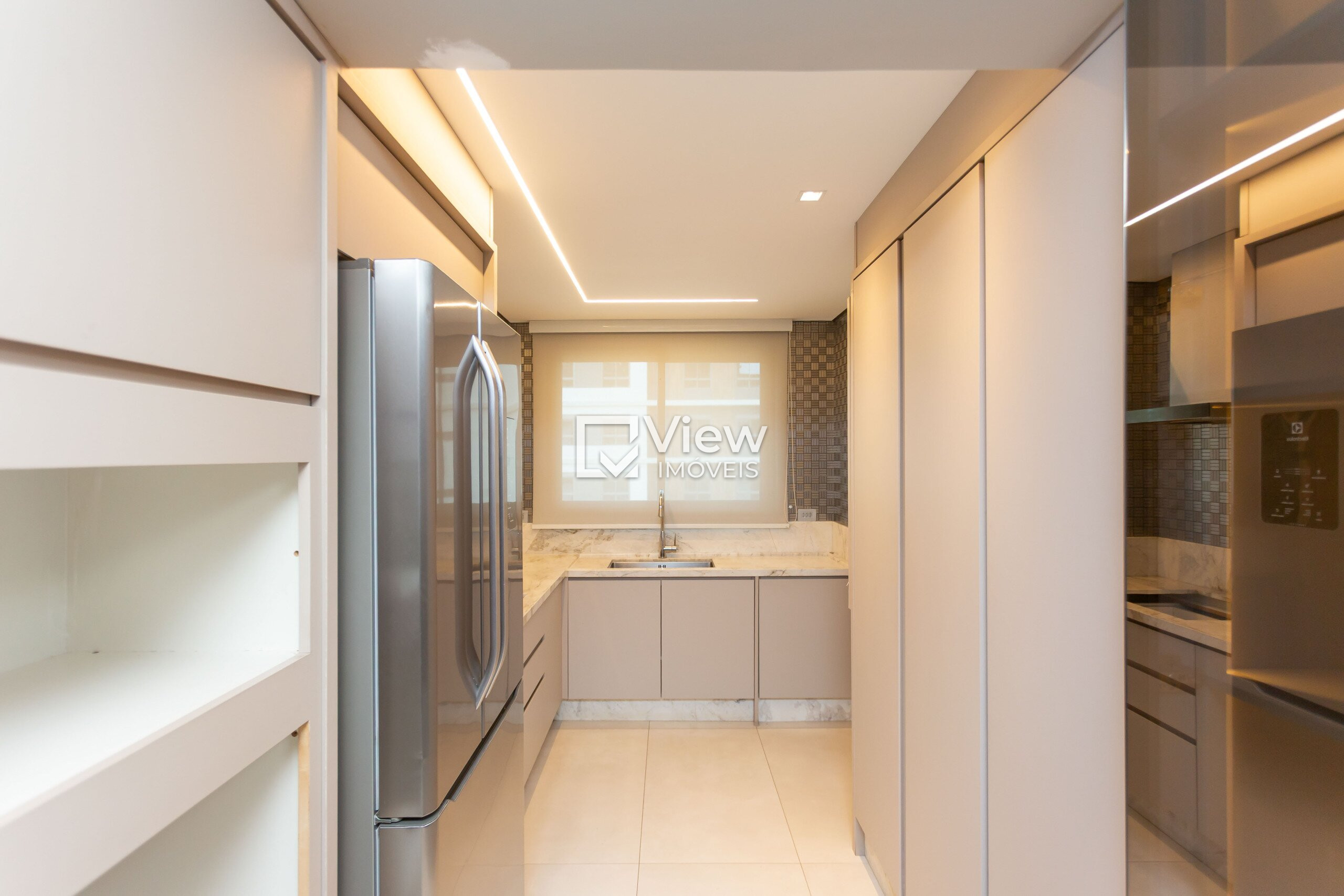A cozinha planejada une funcionalidade e sofisticação. A área de serviço é separada e conta com banheiro de serviço, assegurando total comodidade.