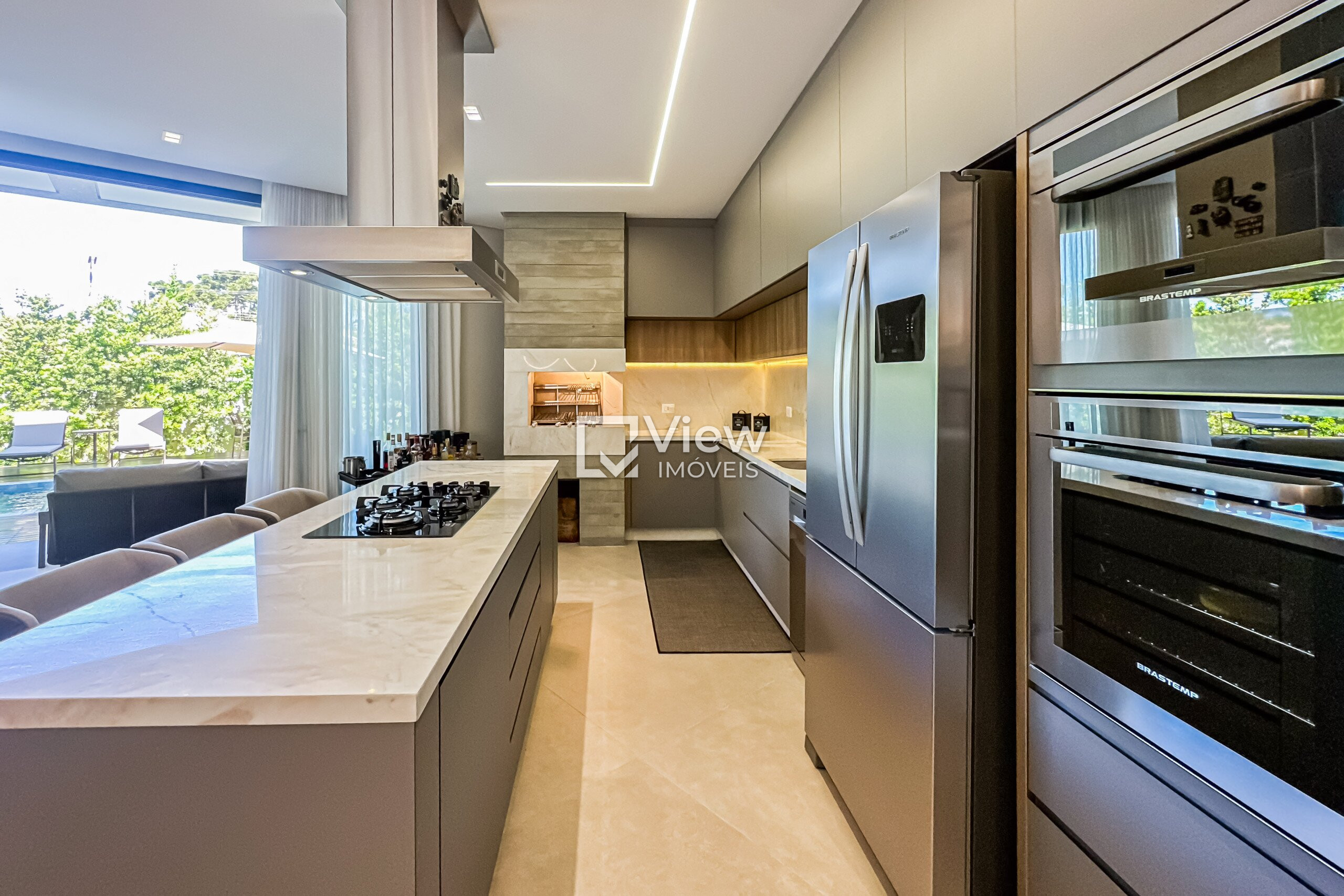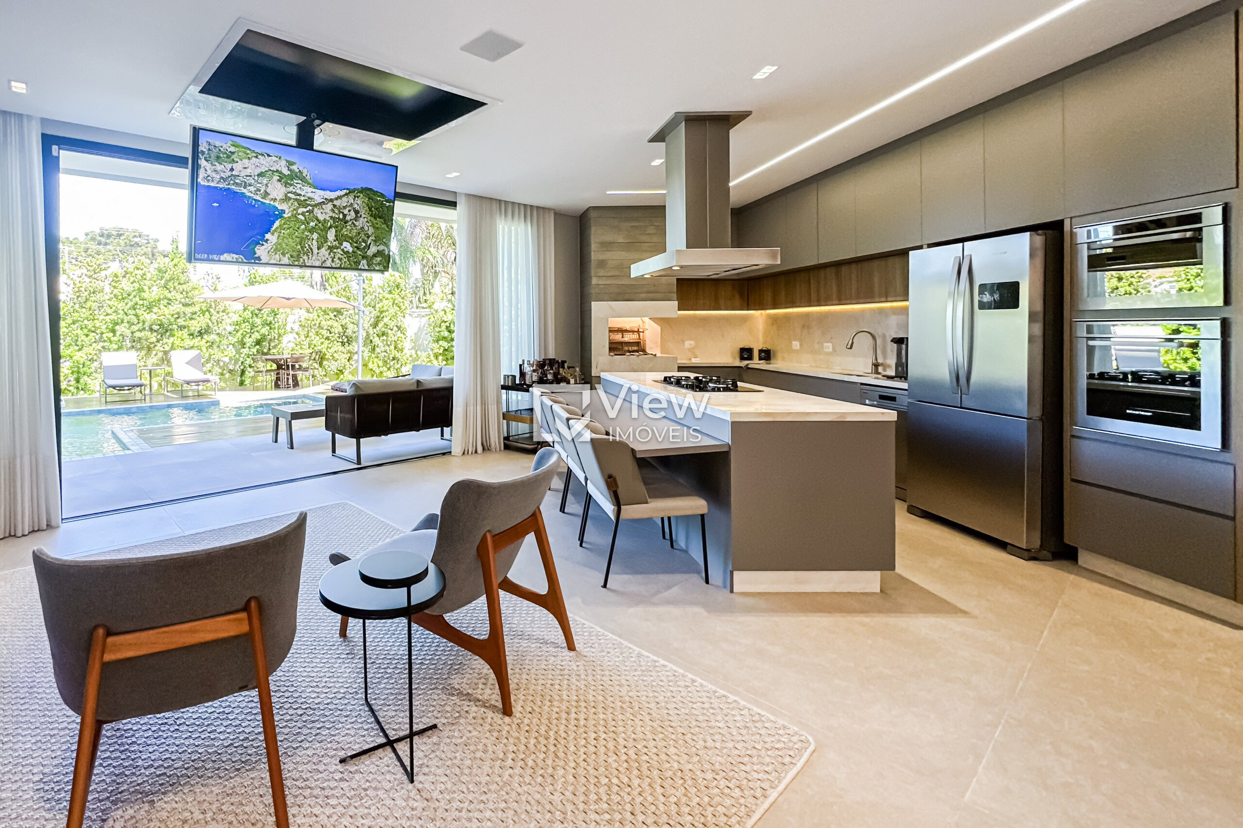 Cozinha gourmet completa, com acabamento premium, churrasqueira, TV e integração total com o espaço de lazer — o cenário ideal para receber com estilo