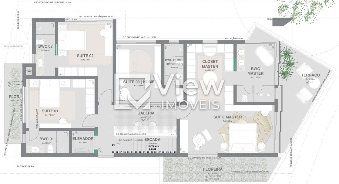 2º PAVIMENTO: 4 suítes (1 master com closet, cuba, chuveiro duplo, banheira e sacada) + home office.