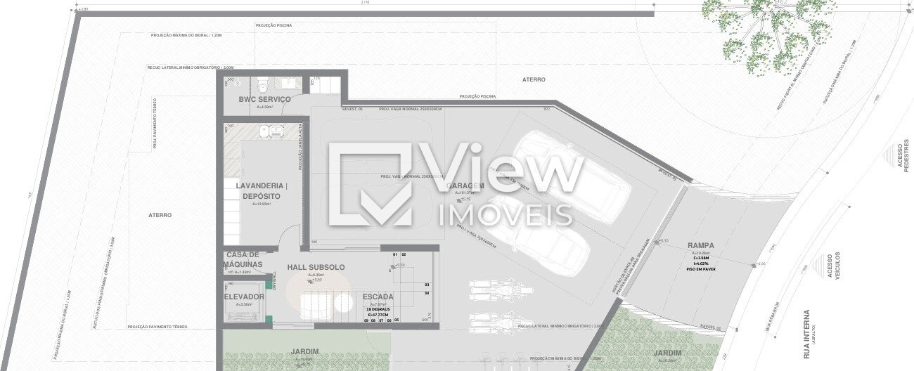 SUBSOLO: Garagem para 5 carros, área de serviço, bwc e hall com acesso a elevador e jardim.