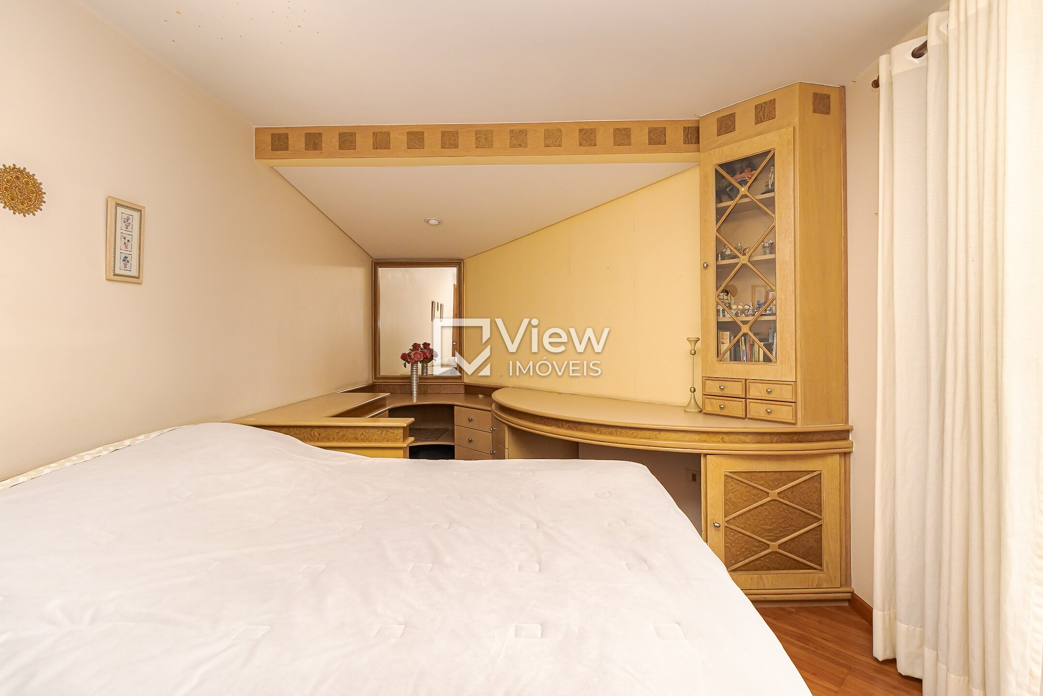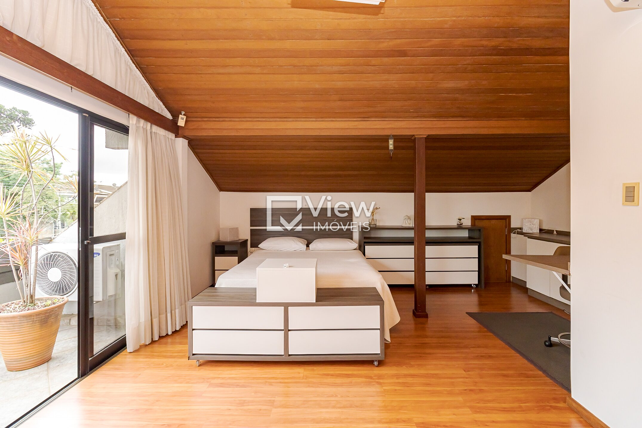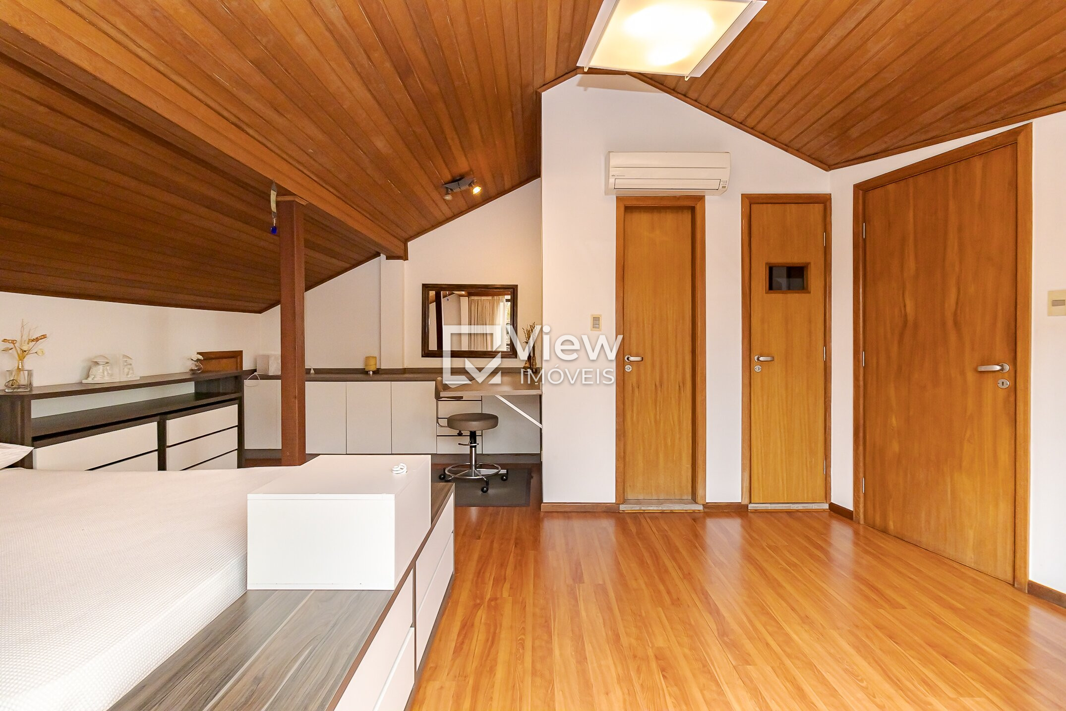 O ático abriga uma suíte com sauna seca, além de um escritório e sacada, criando um ambiente reservado e versátil, perfeito para descanso ou trabalho em home office.