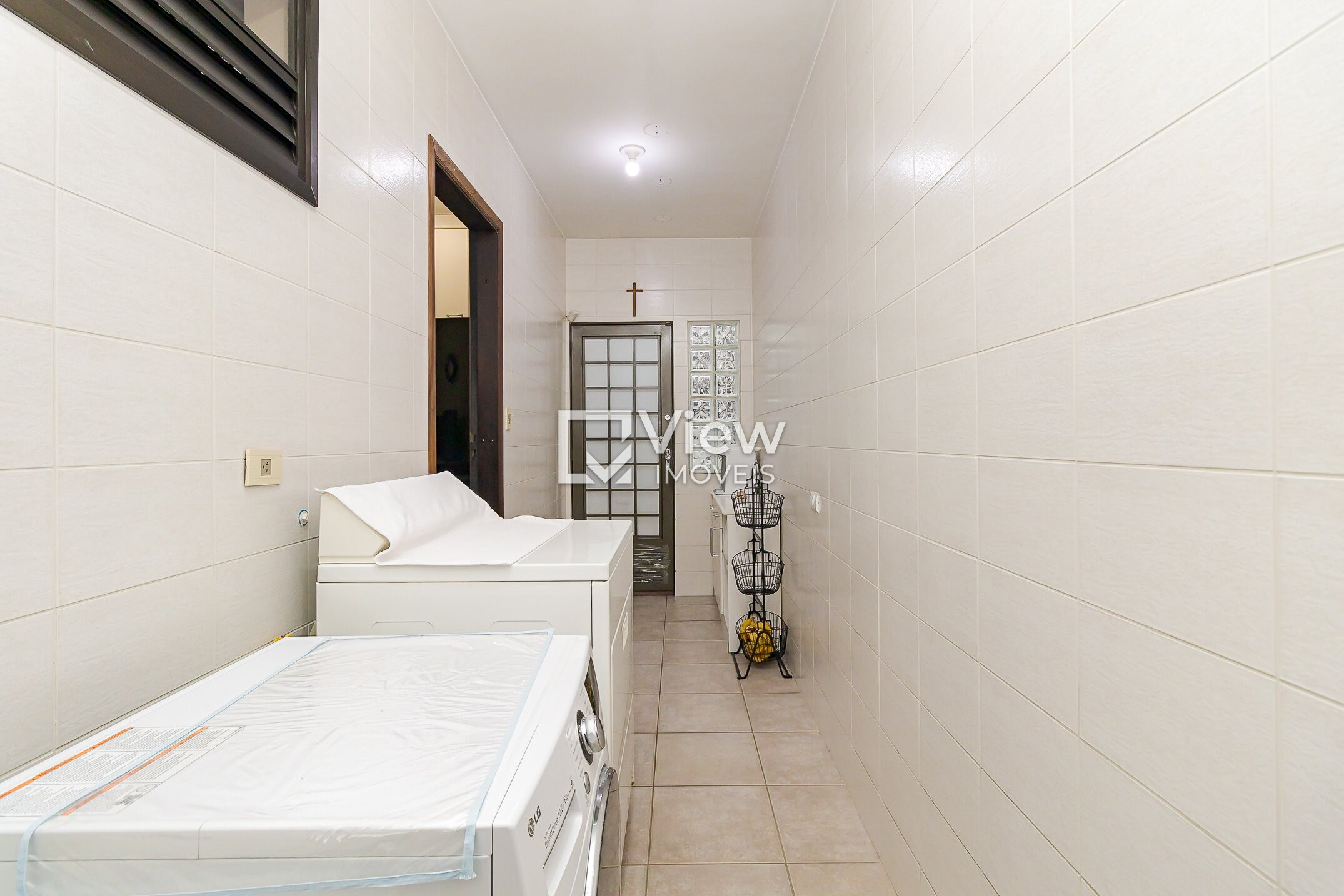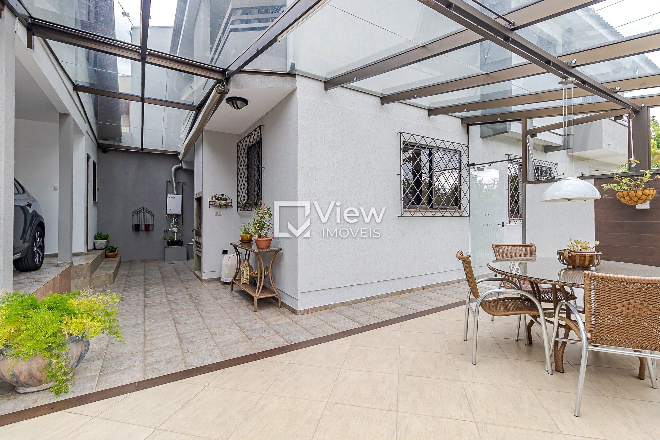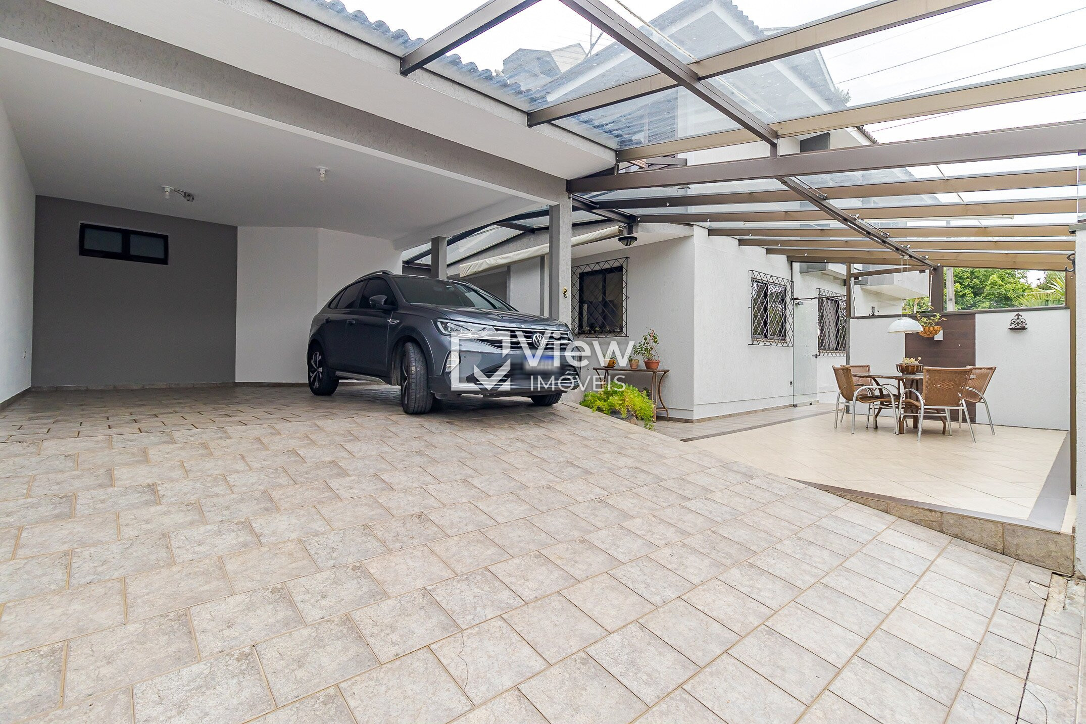 A área externa oferece living externo com churrasqueira e garagem para quatro veículos, sendo duas vagas cobertas e duas descobertas.