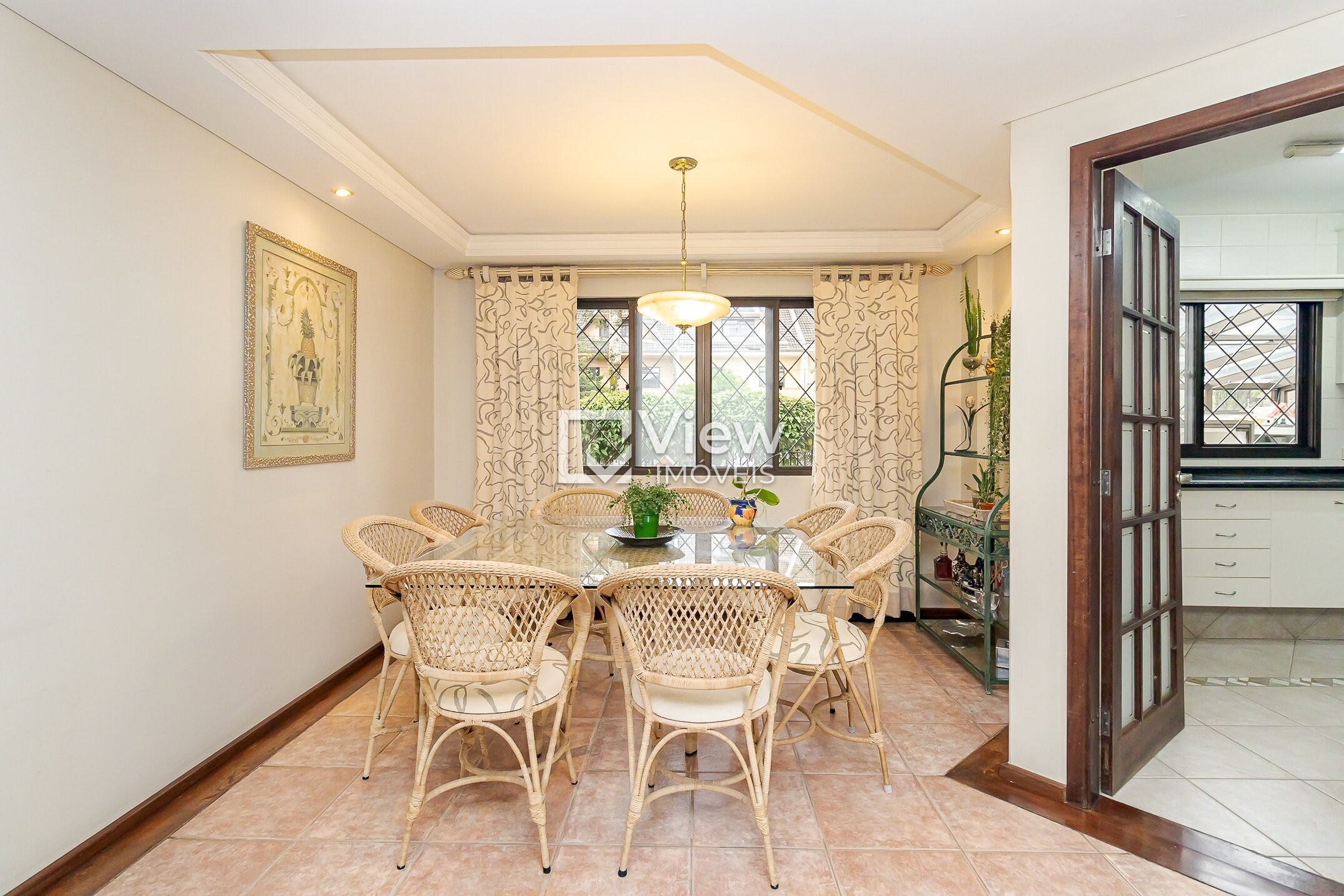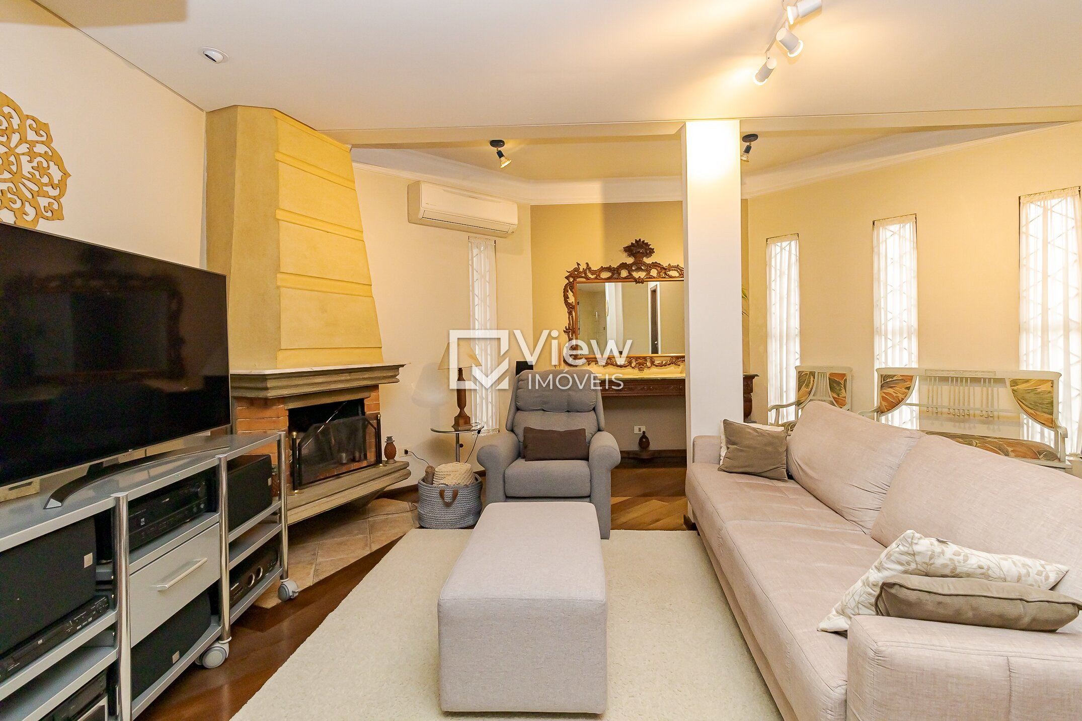 No pavimento térreo, a casa conta com uma sala ampla com lareira, ideal para momentos de convivência, além de cozinha separada, com espaço para mesa de almoço e despensa. Há ainda lavabo e lavanderia independente, garantindo praticidade no dia a dia.